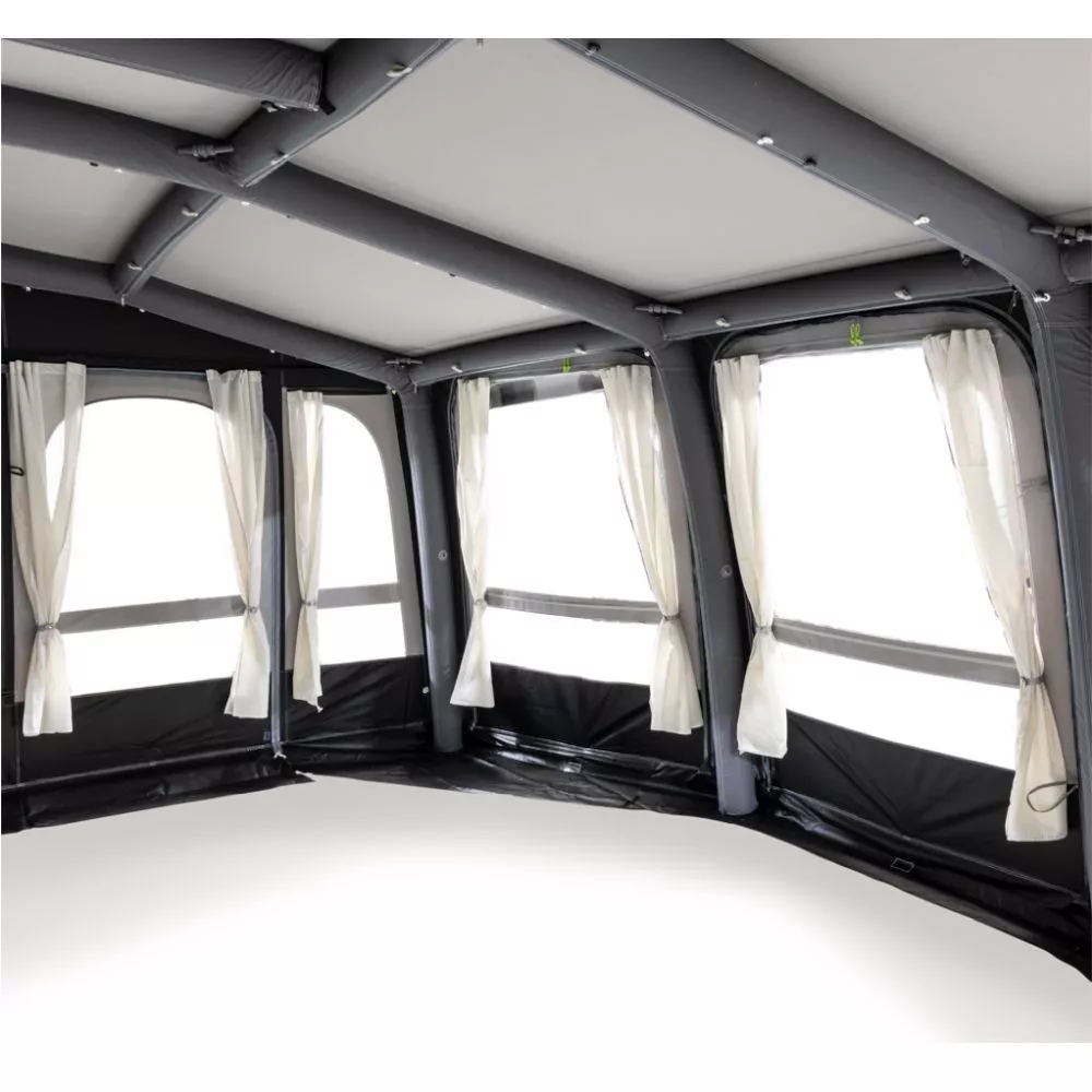 Das Luftvorzelt Ace Air All-Season 400 von Dometic bietet Stil und volle Funktionalität. An heissen Sommertagen kannst du Front- und Seitenelemente per Reissverschluss entfernen. So entsteht ein luftiges Pavillion. Grosse Panoramafenster lassen viel Tageslicht ins Zeltinnere und von drinnen hast du einen hervorragenden Blick nach draussen. Um deine Privatsphäre zu bewahren, kannst du die mitgelieferten Vorhänge schliessen.