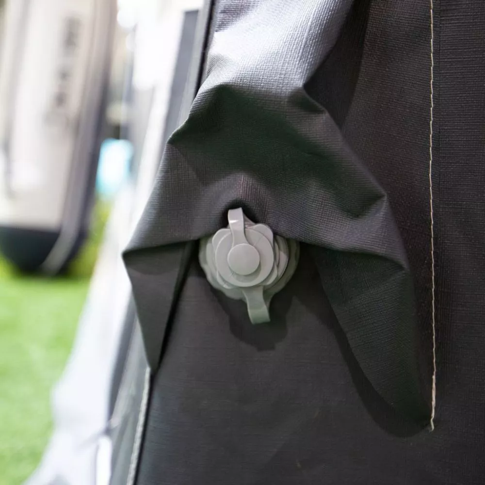 Um sich auch auf Wind und Sturm noch besser zu schützen, kannst du die optional erhältliche Safe-Lock-Sicherheitsgurte verwenden. Die passenden Steckschnallen dazu sind bereits am Vorzelt angebracht.