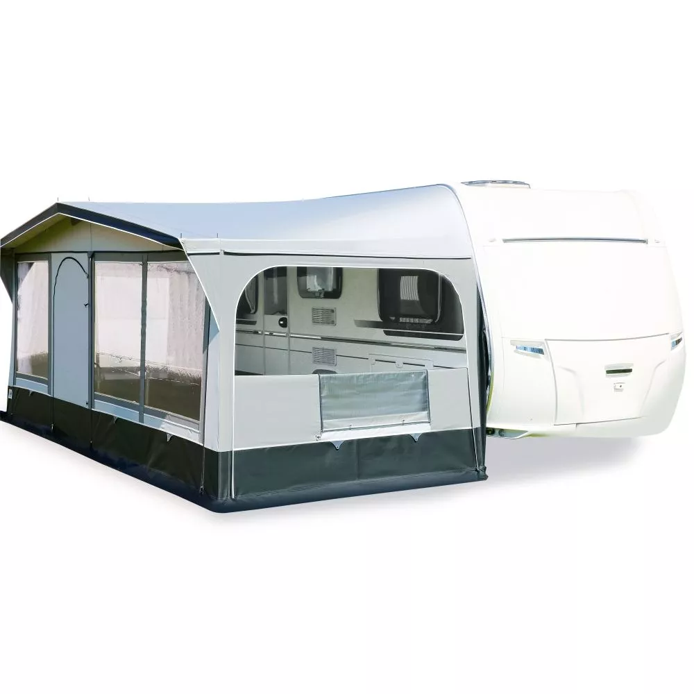 Das schlichte Caravan-Vorzelt bietet alles, was für den Alltag auf dem Campingplatz benötigt wird. Flexible Aufbaumöglichkeiten lassen einen wundervollen Campingurlaub bei jedem Wetter zu. Fünf Zeltteile bestehend aus dem Dach, zwei Vorder- und zwei Seitenwandelementen, sowie das 28 mm Aluminiumgestänge sorgen für leichten Auf- und Abbauen.